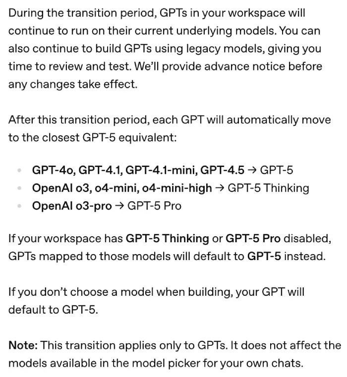 The clearest piece of paper to read is OpenAI’s help page for GPTs. It explains that, through mid-October, custom GPTs in ChatGPT workspaces will keep running on their current underlying models while a transition to GPT-5 equivalents happens. In short, this guidance applies to workspace GPTs and the way those custom bots map to GPT-5 variants, not to the model list you choose for your individual chats. That nuance is the heart of the confusion.