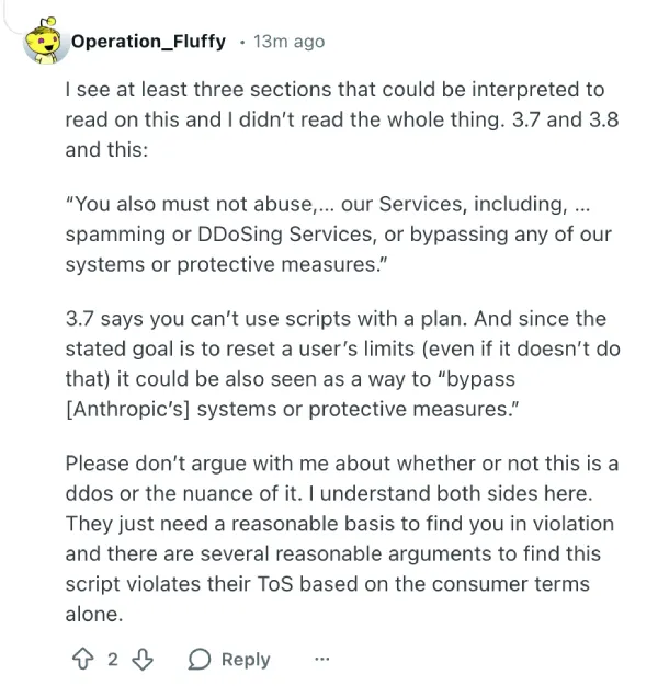 Some users dug into Anthropic’s own rulebook to back that up. The Consumer Terms prohibit using scripts or automated tools with consumer plans, and explicitly bar attempts to bypass systems or protective measures, which is exactly what resetting usage windows on a timer is trying to do.
