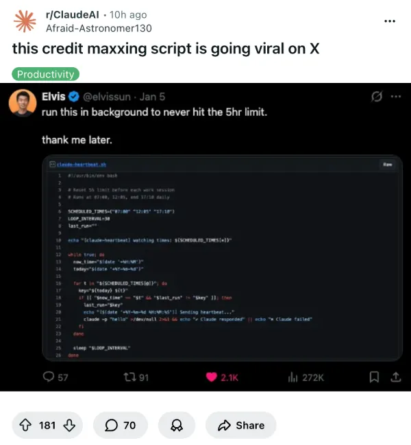 That is where the fun stops. A post on r/ClaudeAI titled “this credit maxxing script is going viral on X” quickly turned into a warning thread, with a mod pinning a comment that calls it “a fantastic way to get your account banned” and reminds people this is exactly the sort of abuse that leads to harsher limits for everyone. Dozens of replies also seem to share the same concern: you are not getting more credits, you are gaming the timing, and doing it with automation looks a lot like spam from the platform’s point of view.