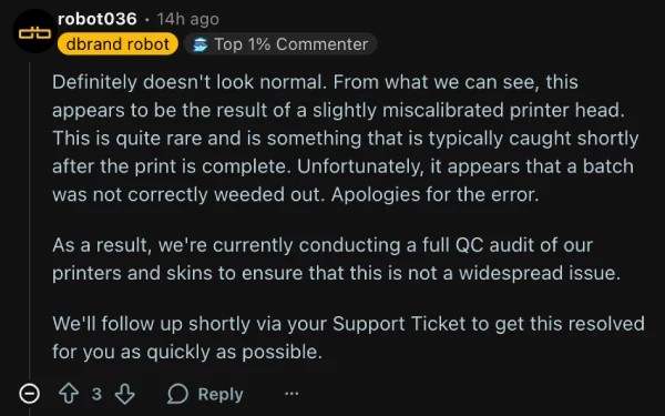 A Dbrand account replied directly in the thread, saying the defect appears consistent with a slightly misaligned printer head and that this kind of error is rare. According to the response, the company is performing a full quality-control audit of its printers and inventory and will send a corrected replacement to the affected customer.