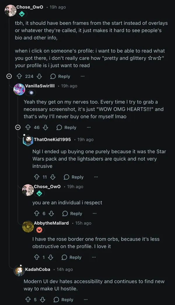 The reaction online has been mixed, though criticism is running louder than praise. The top comment on the Reddit thread argues that frames are actually a better design choice than the current profile effects, which float over the entire profile and can bury bio text.