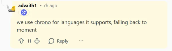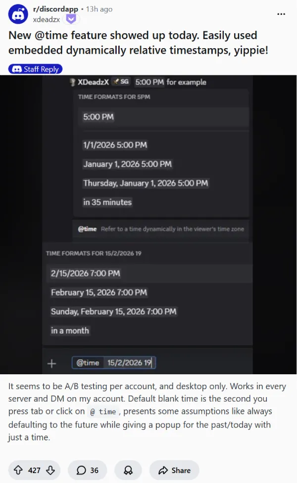A Discord staff member, advaith1, actually jumped into the thread to clarify some technical details. According to the staff reply, Discord uses a library called Chrono for supported languages and falls back to Moment for others. That explains why the feature can understand such a wide range of inputs, from “in 2 weeks” to specific dates like “1/3/26 3pm.”