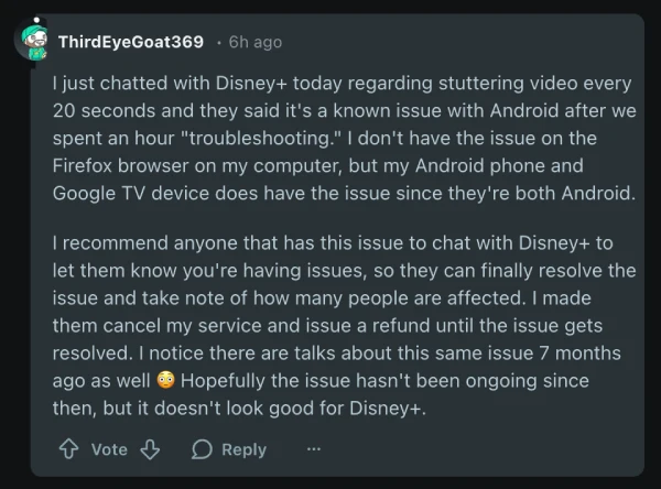 Another user, ThirdEyeGoat369, says they directly contacted Disney+ support after seeing stutters roughly every 20 seconds on both a Google TV device and an Android phone. According to their chat with support, Disney+ acknowledged the problem as a known issue on Android after an extended troubleshooting session.
