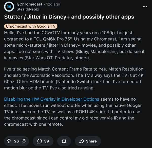 One of the most active threads comes from Reddit user StealthRabbi in the r/Chromecast community, who says the problem shows up consistently in Disney+ movies like Star Wars and Predator. Interestingly, TV shows such as The Mandalorian and Bluey appear mostly unaffected. The same content plays smoothly when using a Roku stick or a TV’s native Google TV app, pointing the finger squarely at the Disney+ Android app or how it interacts with certain hardware.