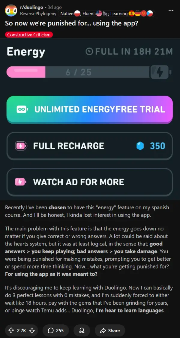 Duolingo says energy creates a “more balanced experience” that supports its free education mission. But when longtime users are actively searching for alternatives and new learners get blocked after three perfect lessons, you have to wonder what kind of balance they’re really going for.