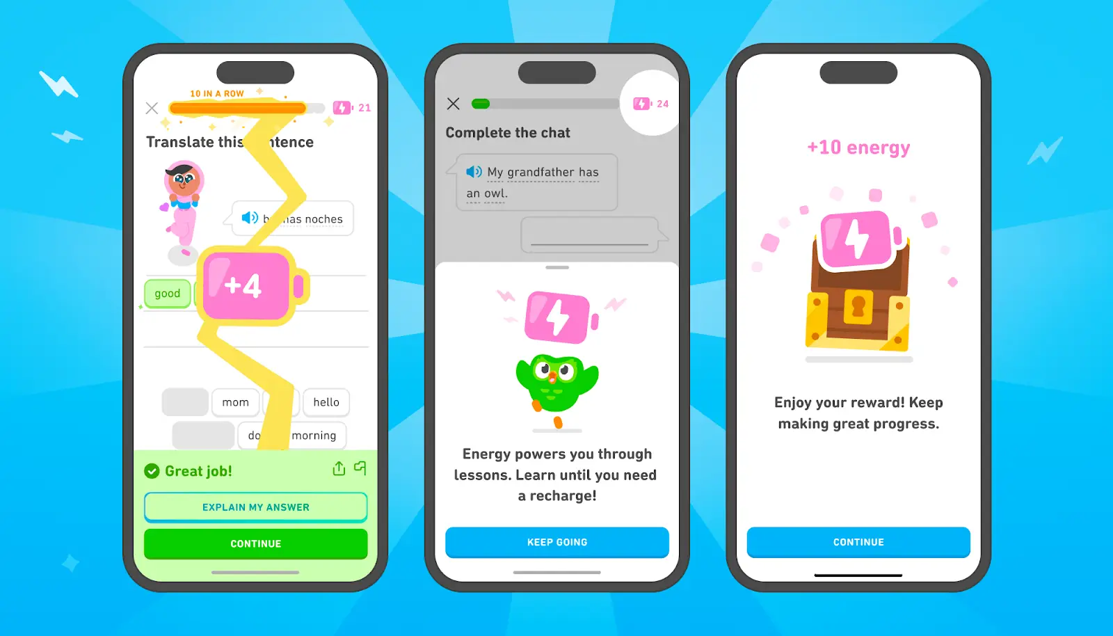 Duolingo’s official explanation centers on helping users develop “healthier learning habits” and complete more lessons. They claim beginners were twice as likely to run out of hearts mid-lesson, which could be discouraging. Energy supposedly fixes this by shifting focus from punishing mistakes to rewarding correct answers with random energy bonuses.