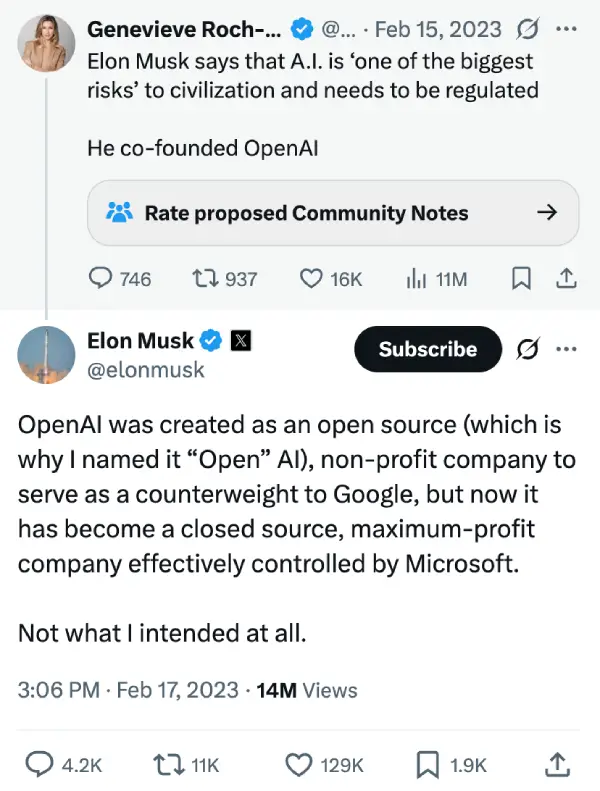 Musk felt betrayed. “OpenAI was created as an open source (which is why I named it ‘Open’ AI), non-profit company to serve as a counterweight to Google, but now it has become a closed source, maximum-profit company effectively controlled by Microsoft,” he wrote on X.