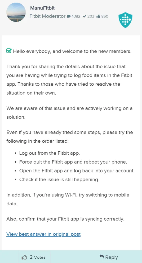 A community moderator confirmed they’re aware of the issue and working on a fix. They suggested the usual troubleshooting steps (logging out, force quitting, rebooting your phone), but users who’d already tried these reported back that the problem persisted. It’s clearly something on Fitbit’s end, not a local device issue.