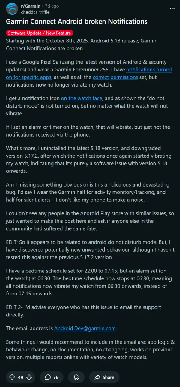 One Forerunner 255 owner first flagged the issue when they noticed their watch had stopped vibrating for notifications despite all permissions being enabled. Testing confirmed the problem: downgrading to version 5.17.2 immediately restored normal notification behavior, pointing to a software-specific issue with the newest release.