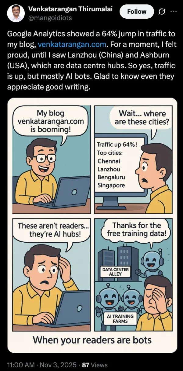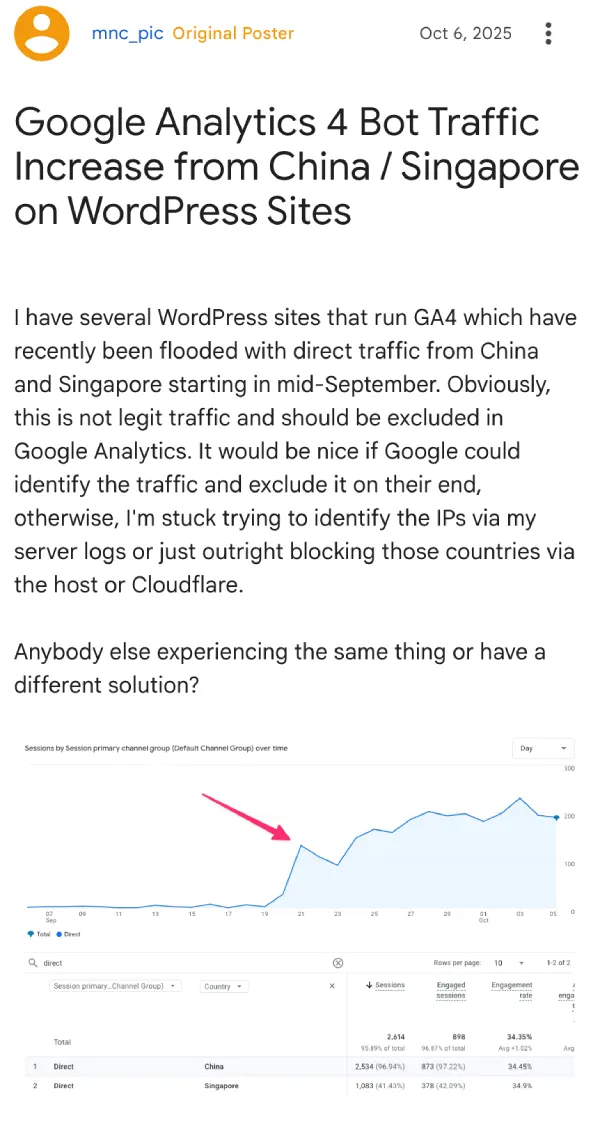 Google has now officially acknowledged this as a known issue. Raúl Revuelta, a Silver Product Expert for SEO and Digital Analytics, escalated the problem in October and confirmed that internal teams identified the cause by early November. Turns out it’s a new type of bot traffic that’s slipping past GA4’s standard filtering systems. These bots are likely scraping content for LLM training purposes, which explains why they’re so persistent.
