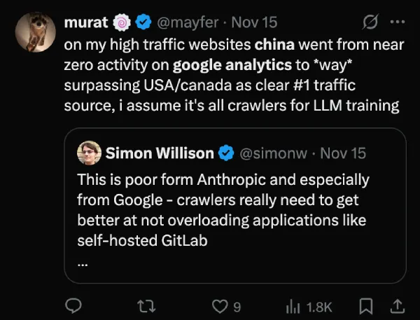 Reports about this have been surfacing on X for the past few weeks. One user pointed out that China went from basically zero activity to becoming the top traffic source by far, beating even the US and Canada.