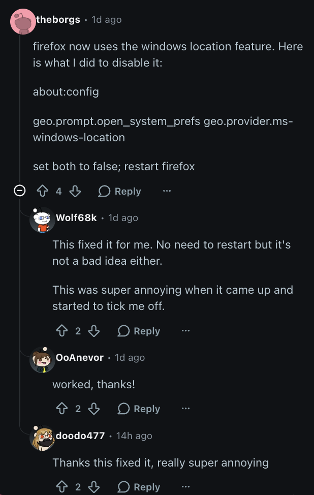 In the replies, user u/theborgs has explained how you can disable it. Even though Firefox uses the Windows Location feature after a recent update, you can still disable it in this way: