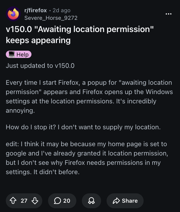 Firefox users on Reddit say version 150.0 keeps showing an ‘Awaiting location permission’ pop-up and opening Windows Location Settings. The browser then proceeds to open Windows Settings, where the location permissions are.