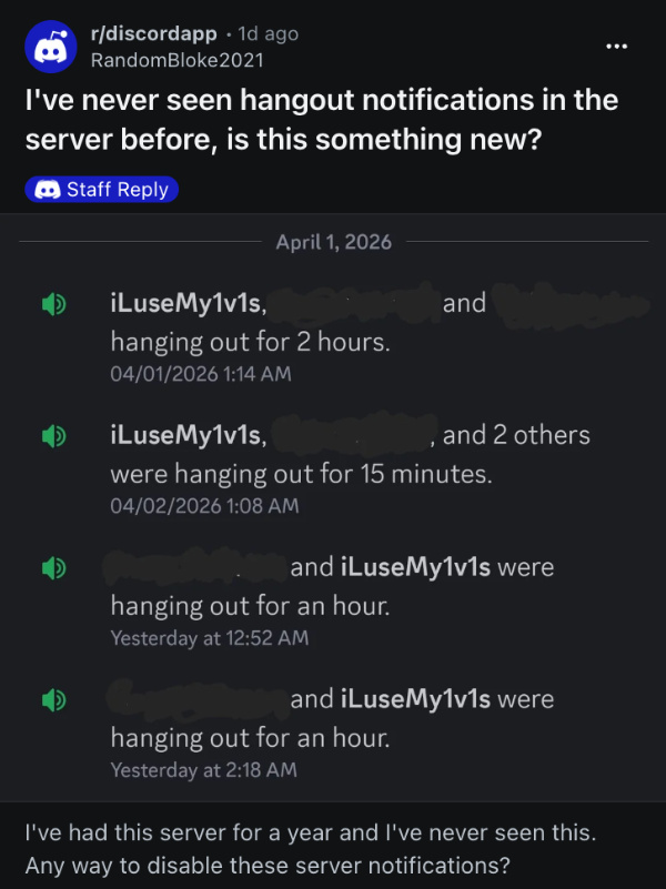 It’s likely sometime in March or April 2026, since a few Discord users reported that they’ve started seeing it around three or four days ago. People annoyed by these notifications say, “I’ve never seen hangout noficiations in the server before.”