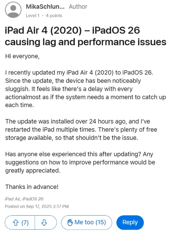 Similarly, you will find many posts on Reddit, Facebook, and the official forums that popped up days or even weeks ago, dating all the way back to the initial iPadOS 26 release.