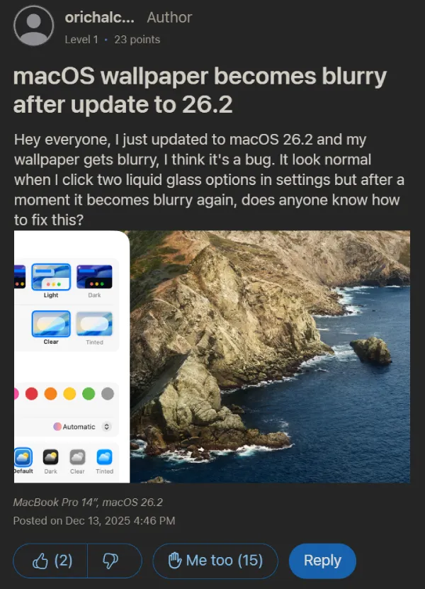 We’ve seen visual bugs in Tahoe before. Users reported similar rendering issues in Mission Control during the 26.0 and 26.1 releases. Apple has been patching things steadily, but 26.2 seems to have introduced new problems while fixing old ones.