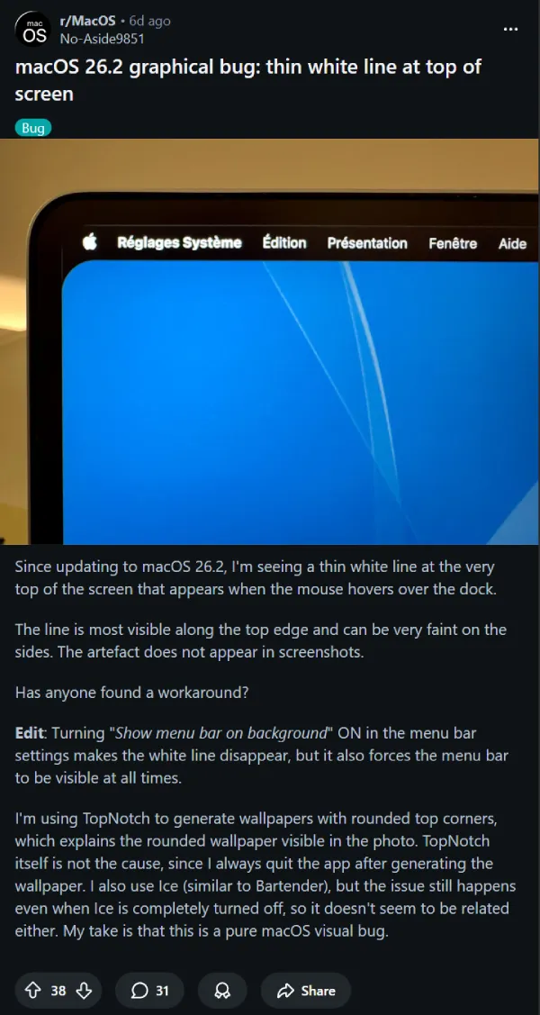 MacOS 26.2 Rendering issue? White outline above menu bar