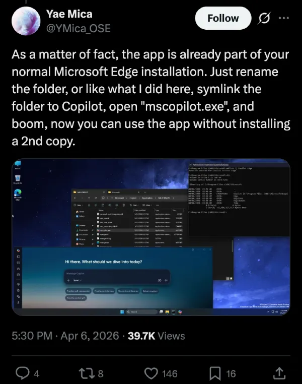 Then another user, Yae Mica, dropped an even simpler workaround. The app is already baked into your normal Microsoft Edge installation. You can just rename the folder or create a symlink pointing to Copilot, run mscopilot.exe, and it works without installing a second copy at all.