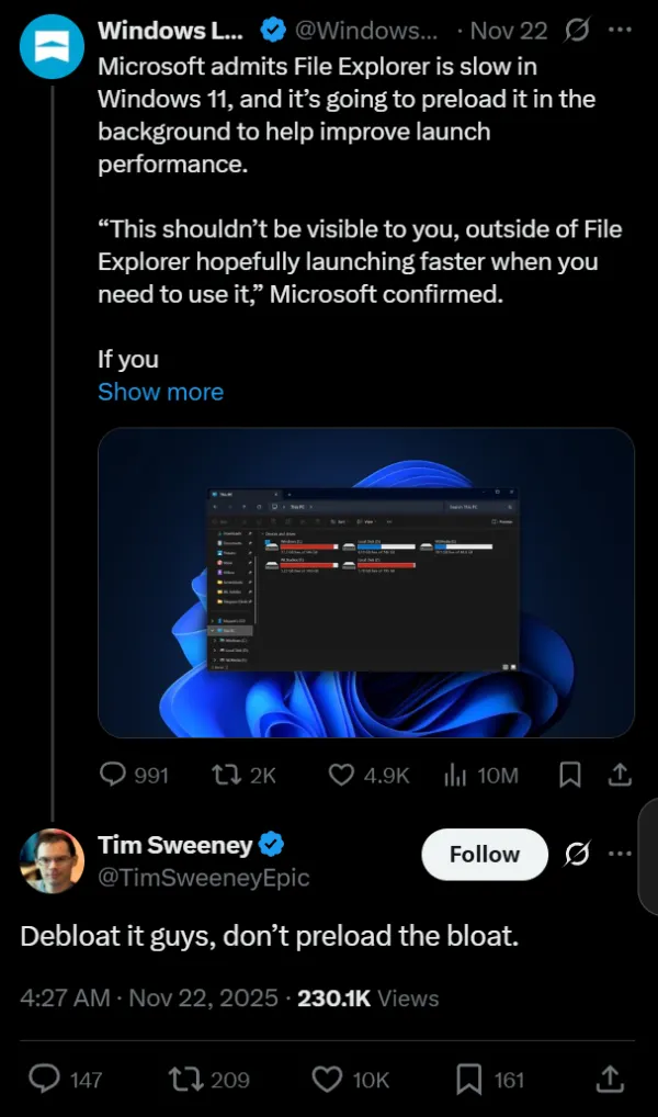 Here’s what’s rubbing people the wrong way: this feels less like a fix and more like a band-aid. One user commented, saying, “So… Stealing more resources in the background instead of just fixing the problem?” Epic Games CEO Tim Sweeney chimed in with equally sharp words: “Debloat it guys, don’t preload the bloat.” Their comment picked up over 10 thousand likes.