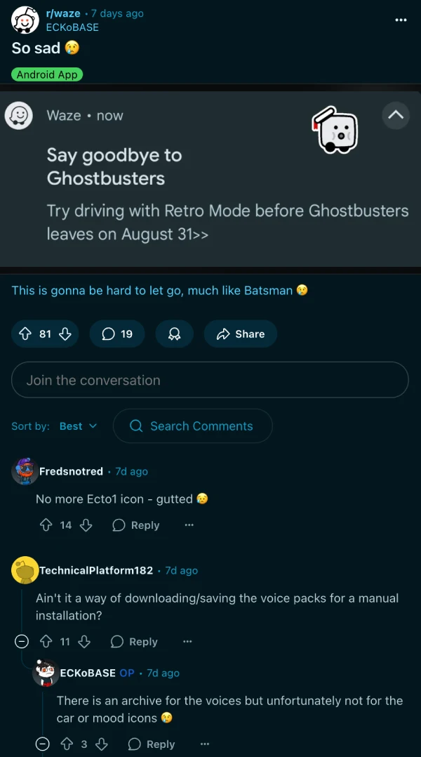 Reddit users are mourning the loss particularly hard, with one commenting “No more Ecto1 icon – gutted 😥” and another lamenting that they hoped it would stick around like some previous voice packs had managed to do. Unlike some voices that have lingered on users’ phones for months or even years after official removal, the Ghostbusters content appears to have been more thoroughly scrubbed from the system.