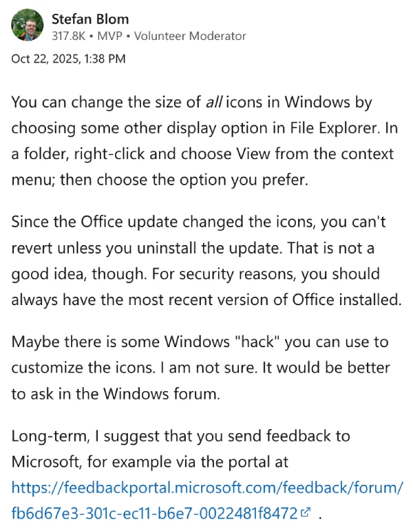 People have been hunting for workarounds. Some are trying to roll back to previous Office builds, though Microsoft support has warned against this for security reasons. Others found temporary fixes by manually replacing icon files in Windows directories, though there’s no guarantee those changes will stick after the next update.