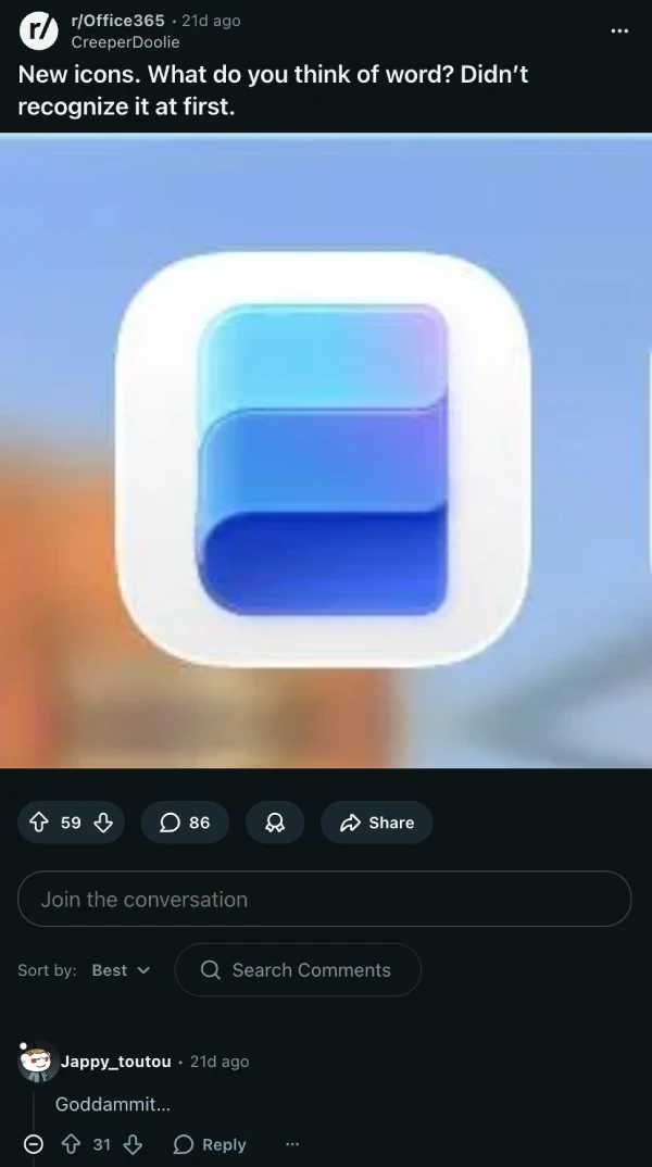 The backlash hit almost immediately. One Reddit user couldn’t even recognize Word at first, posting the new icons with visible confusion. Another commenter summed up the general mood pretty well: “Goddammit…” That single word got 31 upvotes, which tells you everything you need to know about how people feel.