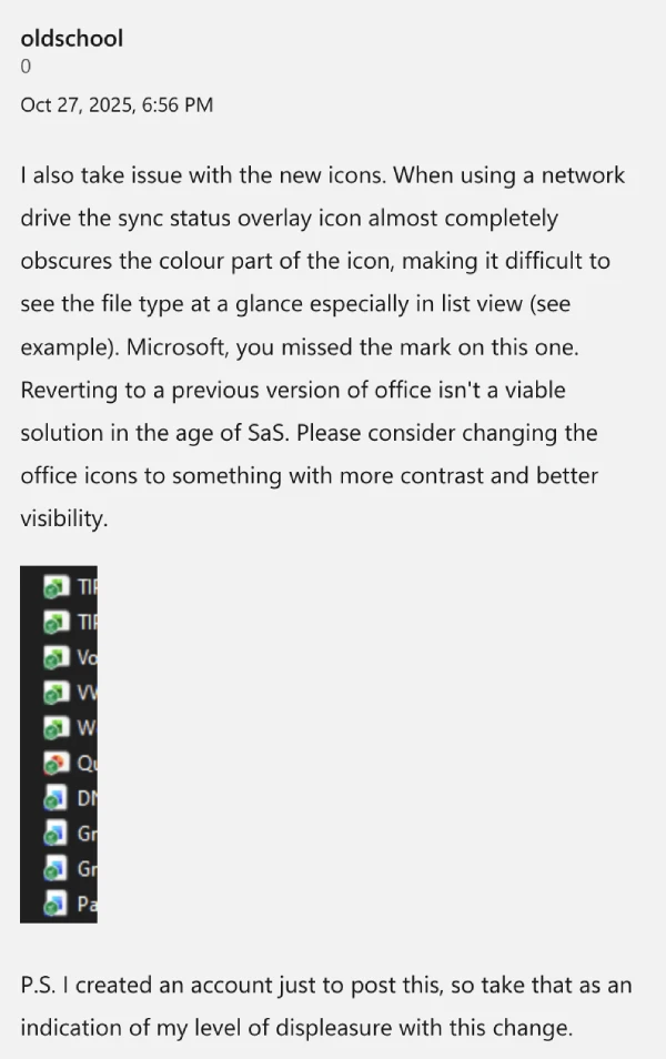 One person created a Microsoft support account specifically to complain about the redesign, noting that sync status overlay icons now completely obscure the small colored portions that actually identify what app you’re looking at. In list view, it’s basically impossible to tell what’s what without reading the file extension.