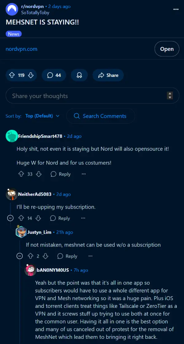 The Reddit community response has been overwhelmingly positive. Many users who jumped ship to alternatives like Tailscale are already planning to return. Some are even calling it a “huge W” for Nord and customers alike.