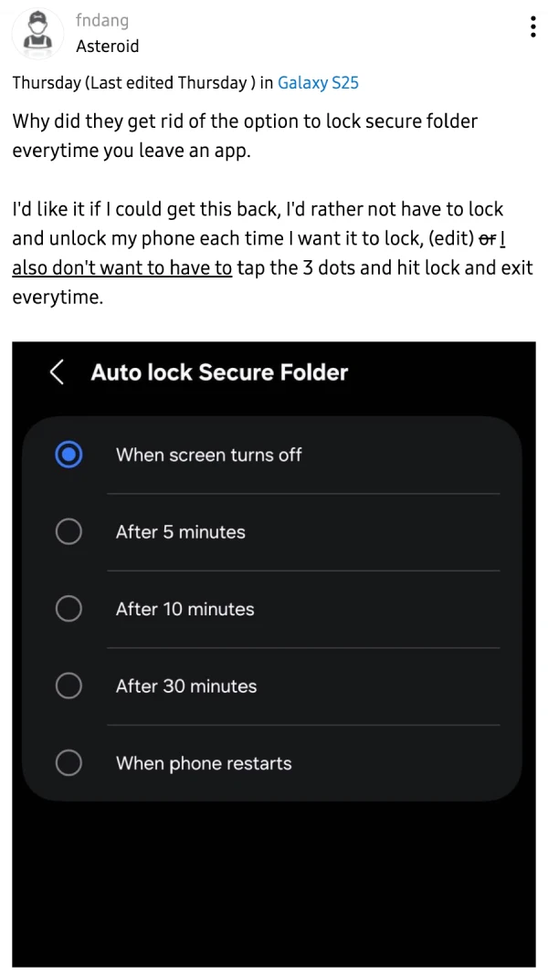 Over on Samsung’s community forums, user fndang kicked off a thread that’s pulled in over 340 views since Thursday. They stated, “I’d rather not have to lock and unlock my phone each time I want it to lock, or I also don’t want to have to tap the 3 dots and hit lock and exit everytime.”