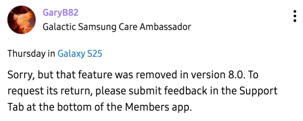 Samsung’s response? Community ambassador GaryB82 confirmed the feature got the boot in version 8.0. Their advice was basically “submit feedback in the Members app if you want it back.” Cool, thanks for that.