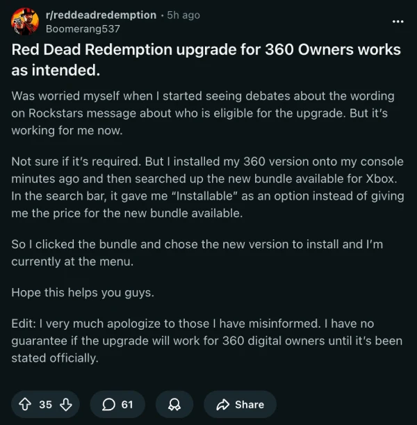 That has spawned a bunch of theories: that only a specific “Xbox One” build qualifies, that only certain RDR1+RDR2 bundles are upgradeable, or that GTA+ library owners are treated differently. One newer thread suggests some 360 digital owners have finally seen the upgrade start working, hinting at a slow entitlement rollout, but many others still report no change.
