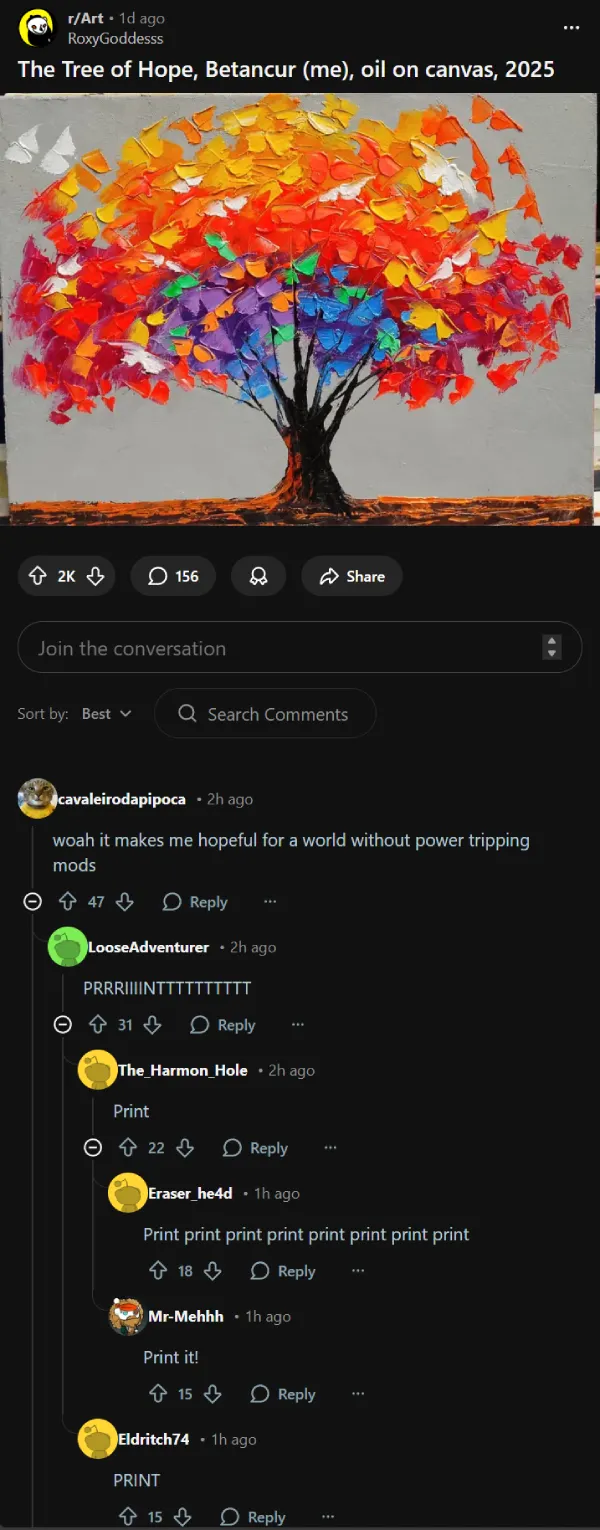 The fallout was swift. Users flooded r/Art posts with comments saying “print” in protest, many receiving bans themselves. Take this one post for example: