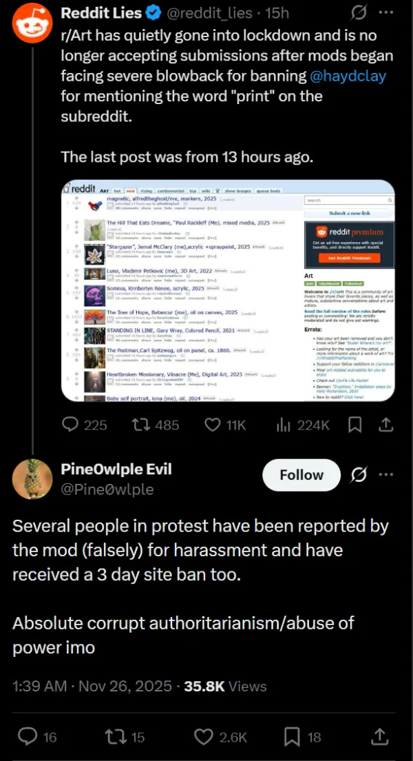 One of Reddit’s largest art communities has gone dark after a moderation decision sparked widespread outrage across social media platforms.