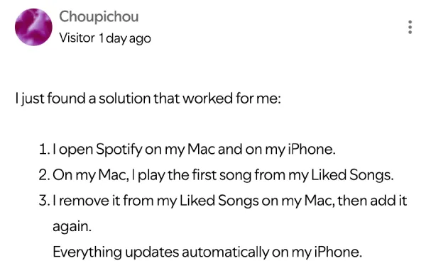 Spotify’s moderator did share a workaround in the thread: open Spotify on desktop, play the first song from your Liked Songs, remove it, then re-add it. Some users say that triggered a sync. There’s also a suggestion to copy all Liked Songs to a new playlist from the desktop app, which should then show up on mobile. That said, at least a few users in the thread report that neither fix worked for them.