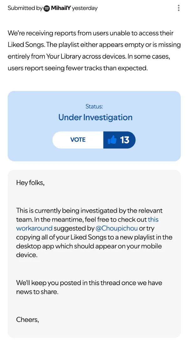 The company’s community forum has an active thread on the issue, which was updated by a moderator with an “Under investigation” status. According to the post, users are either seeing an empty Liked Songs playlist or the section is missing from their library altogether. In some cases, the track count is just lower than it should be.