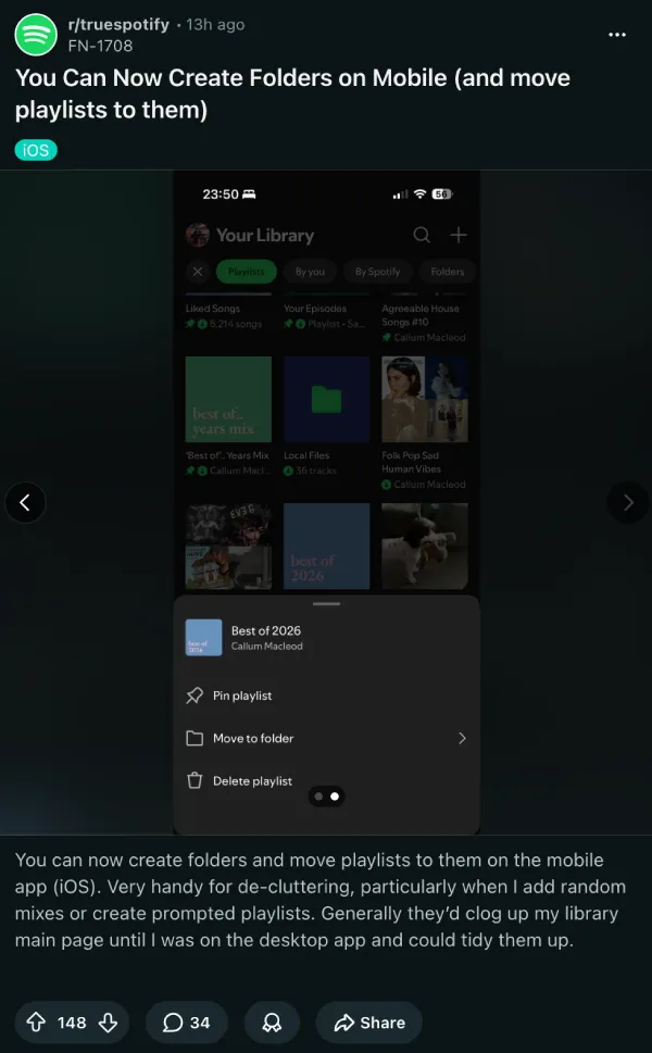 Still, the core ask was always just to have folders on mobile, and that’s now starting to happen. For people managing dozens of playlists on their phone, that alone is a meaningful change.
