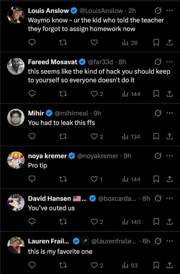 Other riders also jumped in the comments. Some admitted they’ve been quietly doing the same thing for months. Others begged her to delete the post so Waymo wouldn’t patch it. One joked she was the kid who reminded the teacher about homework.