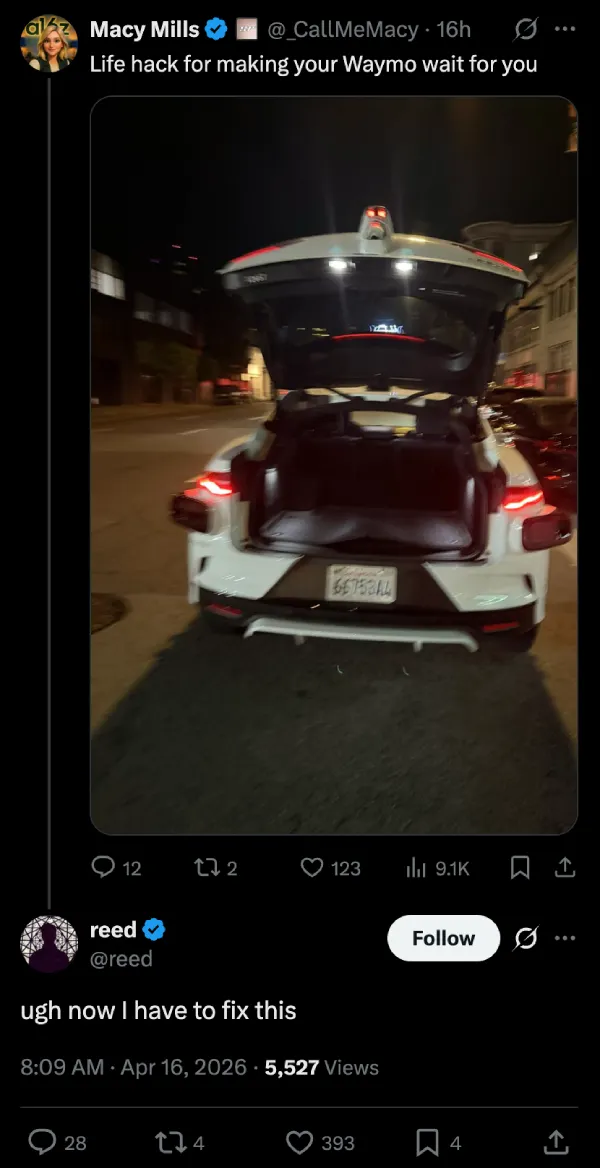 The post drew in a few thousand eyeballs; however, one of those eyeballs was from a Waymo engineer named Reed. They dropped a comment saying, “ugh now I have to fix this.”