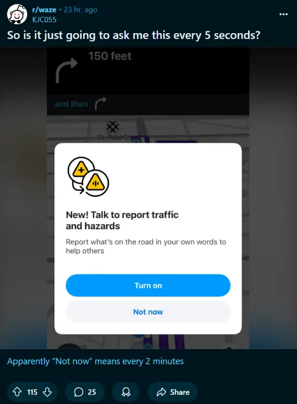 Waze drivers are getting increasingly annoyed with the navigation app’s voice reporting tool that refuses to respect the “Not now” button and keeps popping up.