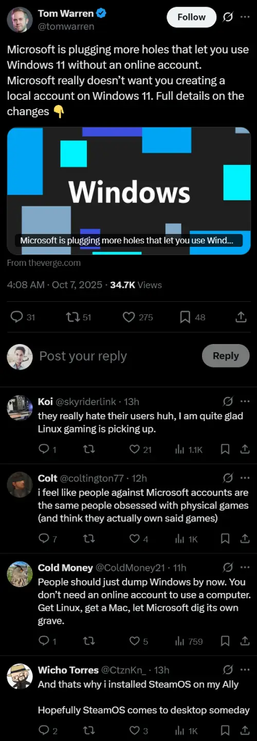 On Reddit’s r/Windows11, a post sharing the news racked up over 400 upvotes and hundreds of comments in hours, with people venting about Microsoft’s “user-hostile” decisions. One frustrated commenter, sonic10158, said: “Microsoft is physically incapable of making a decision that isn’t user-hostile.” Others, like Ellassen, grumbled, “They really don’t want me to keep using their os,” while Catodacat shared switching to a Mac and eyeing Linux next, tired of the constant pushes.
