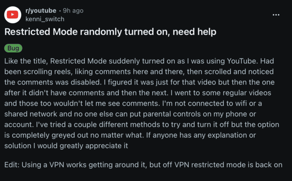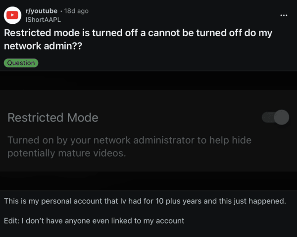 Additionally, there’s an influx of reports about Restricted Mode automatically getting turned on. There have been scattered reports about this over the past few weeks, and the complaints are similar. It’s not an ISP issue, and it looks like a bug because it’s happening on people’s personal accounts.