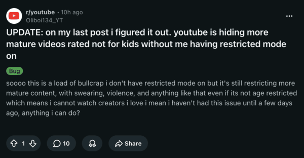 In this specific case (reported on Reddit), the person isn’t an adult. Since the account lacks age verification, YouTube may be automatically applying restrictions based on watch history and other age signals. The person has checked for Restricted Mode settings, but that doesn’t really help.
